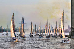 Au son des cornes de brume des nombreux bateaux accompagnateurs c'est une barge "pyrotechnie et jets d'eau" qui a ouvert la voie. Un "feu d'artifice" un peu particulier vu que la nuit n'était pas encore venue. Cette innovation colorée était orchestrée par David Proteau et François Parrot. Derrière la barge en tête des bateaux se trouvait le trois mâts Le Marité.